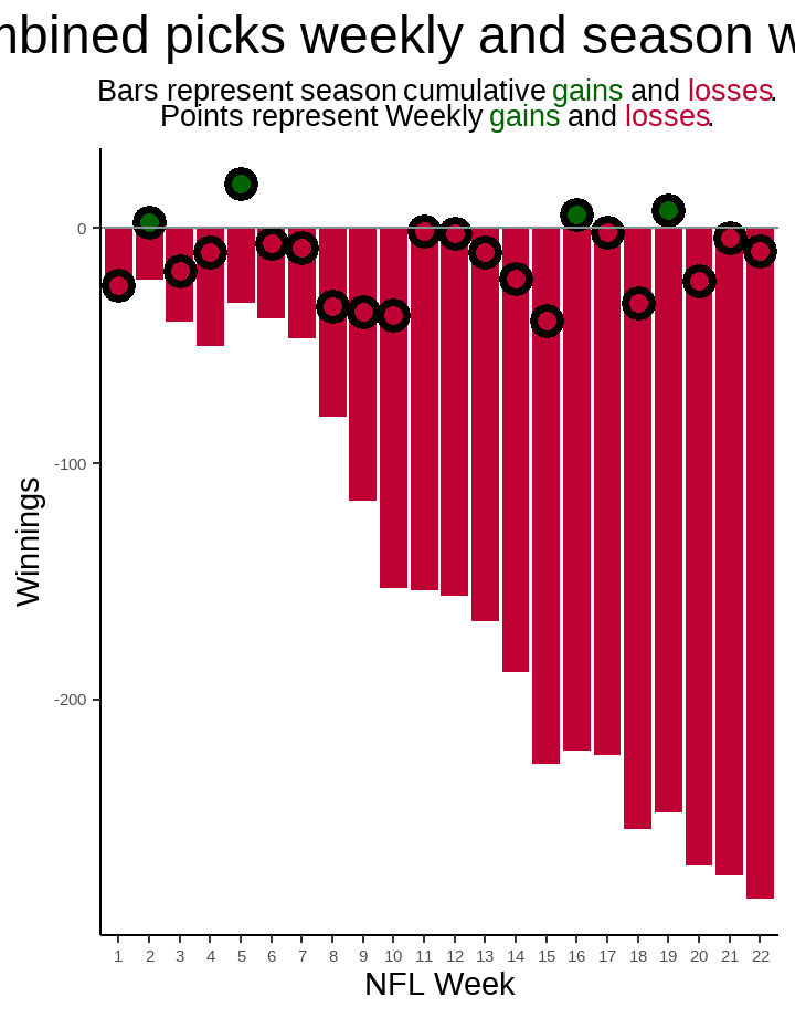 For the season our combined predictions are currently beating or tied with `r comb_espn_experts_beat_season[[length(weeks)]]` of `r espn_experts_season_total[[length(weeks)]]` ESPN Experts.